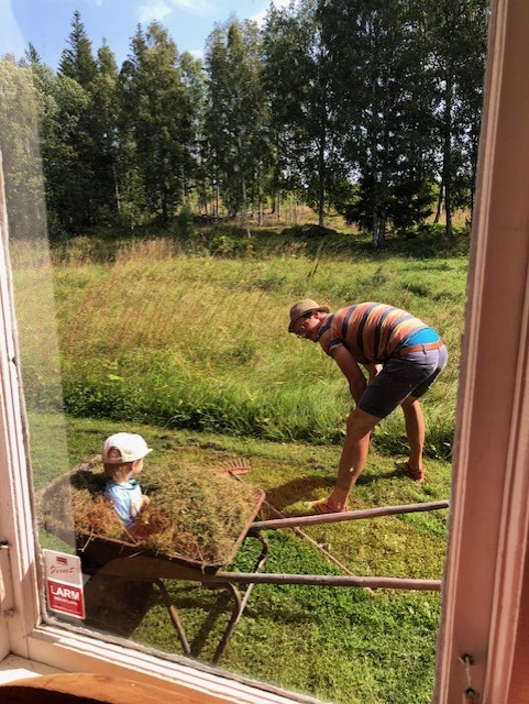 Så kommer vi avslutningsvis till syre. Utan detta livsviktiga ämne för allt levande, kommer inte komposten heller att andas. Jag ser en kompost som en rofylld processande hög som bara ligger där ute i tystnaden och tillåter allt i dess "kropp" arbeta medan den själv slumrar och drömmer om allt grön och fint den kan göra. Lite som Daniel. Efter ett tungt träningspass kan han ligga och sova så tungt så tungt med ryggen mot mig och Hector, och dra djupa lugna andetag och bara låta kroppens organ, bakterier, syresättning och blodomlopp arbeta med allt den brukar — hjärtat pumpar, mat bryts ner, proteiner bygger muskler osv. Komposten behöver andas för att den så kallade aeroba degraderingen ska fungera. Det innebär att nedbrytningen av organsikt material kräver god syretillgång. Vid brist på syre blir det en anaerob nedbrytningsprocess och då kommer vi tillbaka till kväveläckaget vi var inne på tidigare med ammoniaklukten. Det ska alltså inte bli för kompakt i en kompost. Syrebrist är det dock inte när en kompost sjunker ihop, för det är ett tecken på att den fungerar och att materialet har brutits ner. Men om den däremot inte har sjunkit utan bara är tätt packad med framför allt mycket blött och kväverikt material, så behöver den luftas. Då använder man gärna en grep för att vända runt och skapa syre. För att hålla koll på vad man vänt kan man tänka att man skalar en lök och placerar det yttersta i mitten och så vidare. På så sätt kommer det innersta ytterst och vice versa.