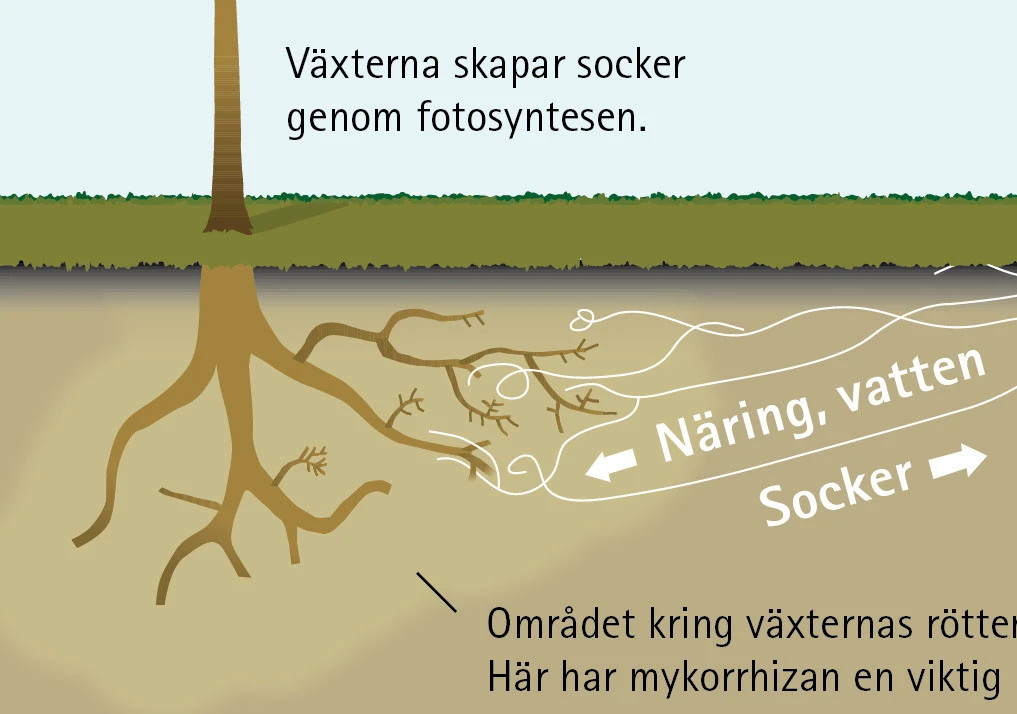 Myko betyder svamp och rhiza betyder rot. Detta är alltså ett sorts system av svampar och växters rötter som under jorden lever i symbios där växter och träd, som kan omvandla koldioxid och vatten till socker (kolhydrater) och syre via fotosyntesen, levererar det till svampen. Svampen får del av växtens socker och växten får i utbyte ett bautastort rotsystem för att kunna ta upp mer näring och vatten ur en mycket större jordvolym än om den hade varit utan mykorrhiza. Mykorrhiza kan också krossa sten och därmed utvinna mineraler till växten. Slutligen trivs bakterier där svampar växer vilket gör jorden full av liv vilket är toppen för växten. Dessa två samarbetar alltså för att tillgodoses viktig näring som den själv har svårt att ta upp, en så kallad symbios. Hade endast den ena organismen fått ut något av detta, hade det istället rört sig om parasitering. 95 procent av träden kan ingå i detta samarbete och 80 procent av alla andra växter kan det. Dock kan inte samtliga kålväxter ingå i symbiosen och heller inte vissa målleväxterna såsom betor och mangold, men spenat är numera ett känt undantag att kunna bilda mykorrhiza. Att detta samarbete kan fungera så bra är för att svampar för många miljoner år sedan började utgöra rotdelen av växter som klättrade upp från havet. Det var på det sättet vi fick landlevande växter.