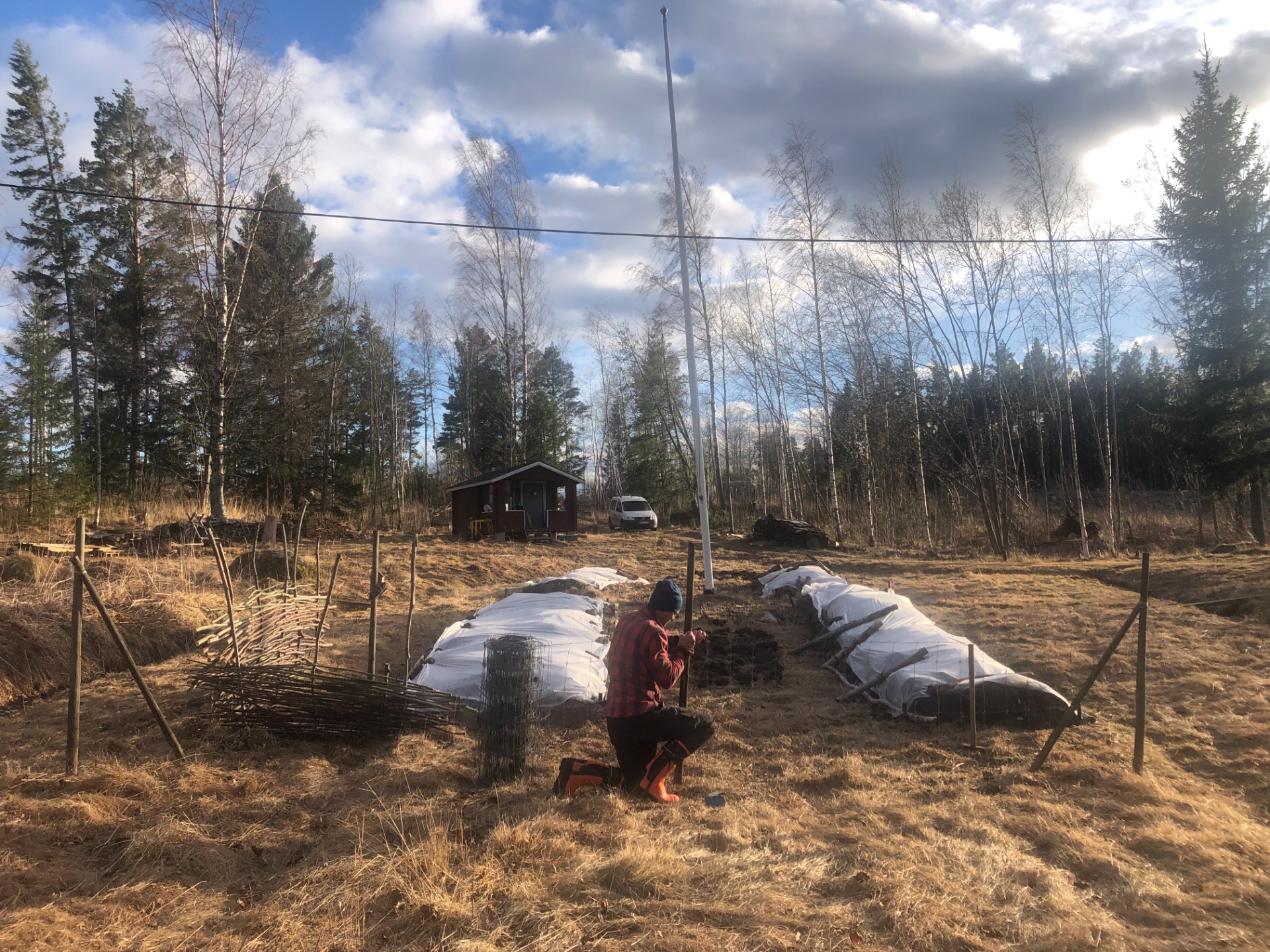 Angående placering, som ju är superviktigt att tänka på innan man säter igång, så har vi hela tiden tänkt att det ska stå längs ner mot skogen. Inte helt dikt an skogen, men ja på undantag, skulle man kunna säga. Med denna plan i huvudet la jag på jordkokor jag grävt bort från dikena i våras. Tänkte att det blir superbra med extra jord på platsen. För så här tänker jag: Gräva bort jord? Köra bort? Och sen lägga grus eller gjuta en platta eller lägga markduk och stenplattor över hela ytan? Varför? Vi kommer definitivt inte har någon makadam där inne och då tvingas byta ut jorden i odlingslådor varje år. Det är inte permakultur. Nej, den metoden är istället lat. Eller effektiv. Lägg istället tiden på att planera från början så blir det mindre jobb sen. Och vår plan är att ha öppet ner till jorden, alltså inte ha något golv. I gångarna har vi antingen flis som bryts ner eller stenplattor som är lätta att flytta ifall vi "möblerar" om inne i växthuset. Möjligen lite grus runt växthuset eller bara vid ingången, mest för att mota undan ogräs och kunna ställa krukor där. Så, öppet ner till jorden. Bra. Att jordfräsa ytan är jag helt emot eftersom det stör mikrolivet och mykorrhizan samt att det bara finfördelar ogräsrötter som sprider sig. En långsam metod är bättre. Så i somras planerade jag ut försådda solrosor på platsen så att de kan luckra upp jorden med sina djupgående rötter och ge den mer kväve och struktur. En egenskap solrosor har. Så himla fint med en solroshäck också, såg jag framför mig. Kom någon upp? Nej. Höga björnlokor, grästuvor av utomjordisk storlek, ormbukar och annat för platsen ogräs dök upp och slukade allt ljus. Många solrosor blev också uppätna av harar eller rådjur. Lite ledsen och fundersam gick jag vidare i livet.